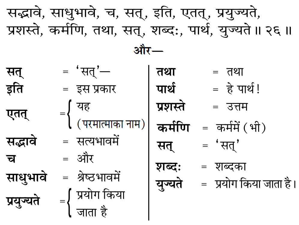 - Chapter 17 verse 26 - ‘सत्‘ यह सारनाम तत् मन्त्र के अन्त में इसी पूर्ण परमात्मा के नाम के साथ सत्यभावमें और श्रेष्ठभावमें प्रयोग किया जाता है तथा हे पार्थ! उत्तम कर्ममें ही सत् शब्द अर्थात् सारनाम का प्रयोग किया जाता है अर्थात् पूर्वोक्त दोनों मन्त्रों ओं व तत् के अन्त में जोड़ा जाता है।